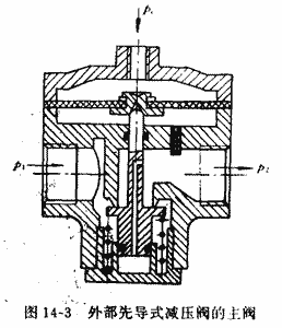 圖14-3所示為外部先導式減壓閥的主閥,其工作原理與直動式相同。在主閥體外部還有一個小型直動式減壓閥,由它來控制主閥。此類閥適于通徑在20mm以上,遠距離(30m以內)、高處、危險處、調壓困難的場合。