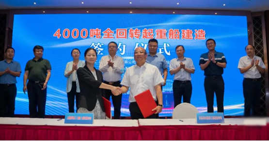 隨著上海振華重工海工集團市場營銷中心總經理許小惠,江蘇蛟龍打撈航務工程有限公司總經理、江蘇龍圣海洋工程有限公司董事長周旭東雙手緊握、互換簽約本,場內響起了經久不息的掌聲,共同祝賀4000噸全回轉起重船建造項目簽約成功!