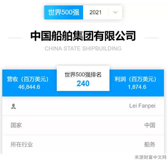 北京時間2021年8月2日,《財富》中英文網(wǎng)站同時發(fā)布2021《財富》世界500強(qiáng)排行榜,中國船舶集團(tuán)有限公司以468.446億美元的營業(yè)收入位列全球榜單第240位。