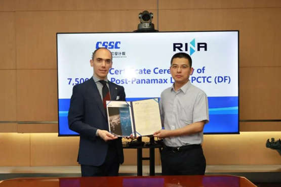 7月20日意大利船級(jí)社為中國(guó)船舶上海船舶研究設(shè)計(jì)院(SDARI)頒發(fā)了7500車雙燃料PCTC的AIP證書。